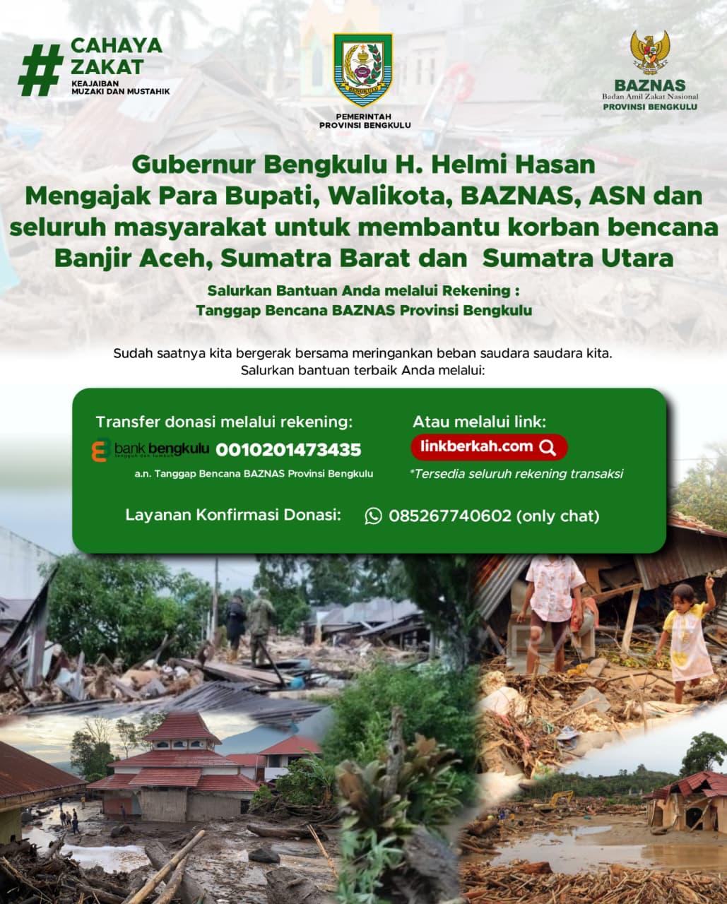 BENGKULUTERKINI.ID – Gubernur Bengkulu Helmi Hasan mengajak seluruh masyarakat Bengkulu untuk bersama-sama menggalang bantuan bagi warga yang terdampak bencana alam di sejumlah wilayah Sumatera, terutama di Sumatera Barat, Sumatera Utara, dan Aceh. Ajakan tersebut disampaikan melalui imbauan resmi Pemerintah Provinsi Bengkulu sebagai bentuk kepedulian terhadap para korban yang kini tengah menghadapi masa sulit.