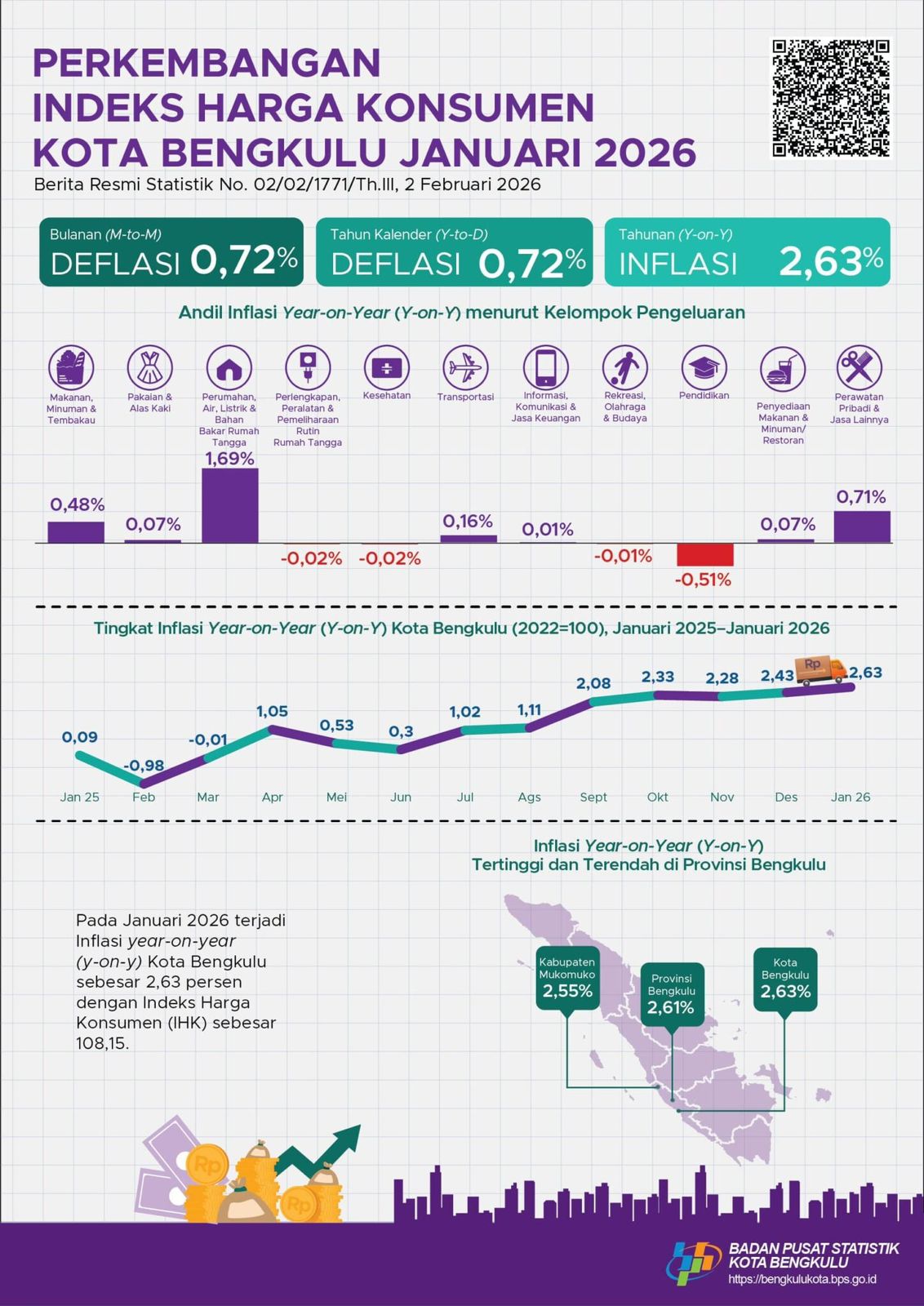 BENGKULUTERKINI.ID – Kota Bengkulu mencatat inflasi tahunan (year on year/y-on-y) sebesar 2,63 persen pada Januari 2026. Sementara itu, secara bulanan (month to month/m-to-m) dan tahun kalender berjalan (year to date/y-to-d), Bengkulu justru mengalami deflasi sebesar 0,72 persen dengan Indeks Harga Konsumen (IHK) sebesar 108,15.