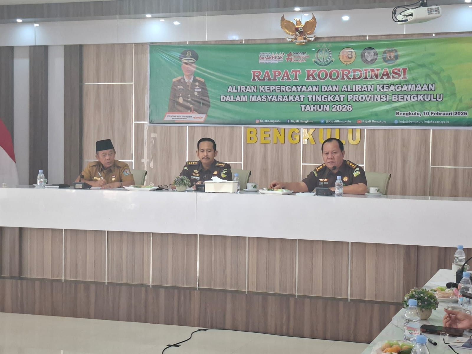 BENGKULUTERKINI.ID – Kejaksaan Tinggi Bengkulu menggelar Rapat Koordinasi Pengawasan Aliran Kepercayaan dan Aliran Keagamaan dalam Masyarakat (PAKEM) tingkat Provinsi Bengkulu tahun 2026 bersama Korem 041/Gamas, Polda Bengkulu, Forum Kerukunan Umat Beragama (FKUB), Badan Kesatuan Bangsa dan Politik (Kesbangpol), serta Kantor Wilayah Kementerian Agama Provinsi Bengkulu.