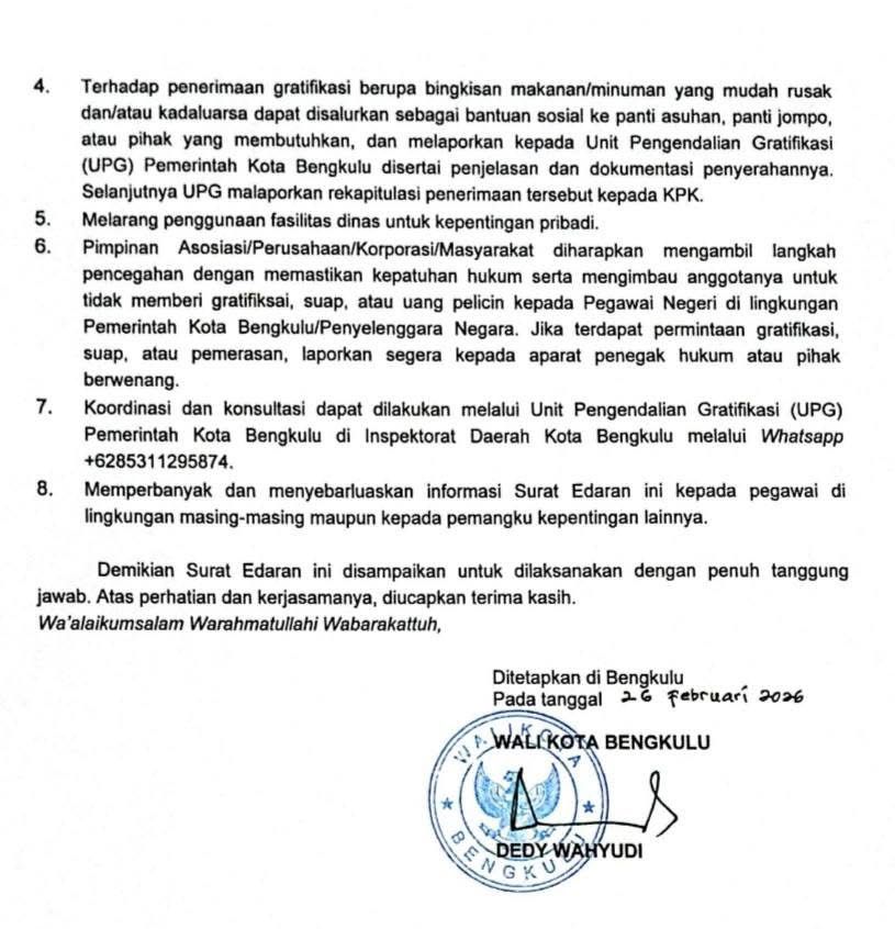 Surat edaran tersebut diteken pada 26 Februari 2026 dan ditujukan kepada seluruh jajaran pejabat dan pegawai di lingkungan Pemkot Bengkulu.